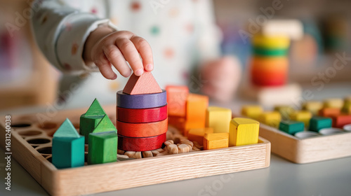 Child's hand placing colorful wooden pieces on top of each other, forming a triangle, demonstrating early childhood development and understanding of shapes