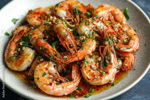 Chili lime sauce shrimp salad on a white plate Bird s eye view