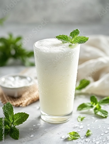 Chilled ayran drink with a hint of mint in a tall glass with condensation droplets, surrounded by mint sprigs and a rustic napkin in a bright and clean setting Generative AI