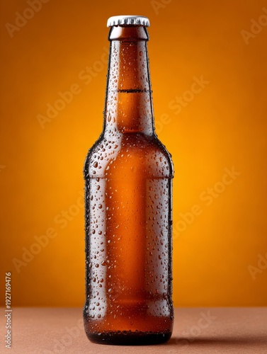 beer, bottle, condensation, cold, drink, beverage, alcohol, refreshment, orange background, droplet, isolated, amber, brewing, lager, brewery, thirst, chill, summer, bar, pub, party, celebration