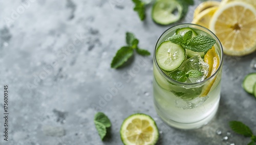 Chilled cucumber lemonade with mint and lemon slices for a refreshing summer drink on a neutral backdrop. Healthy detox beverage idea with ample space for text.