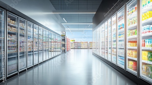 Chilled goods in a supermarket large refrigerated aisle, with clear organization and ample space. Copy text space available.