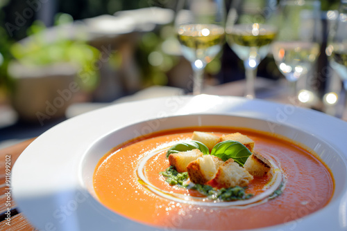 Chilled tomato and basil soup, elegantly plated with a drizzle of olive oil and croutons, against a sunny outdoor dining backdrop.