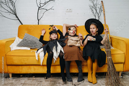 caucasian, people, person, human, children, children, girl, tween, youngster, childhood, young, little, halloween, eve, party, holiday, occasion, event, celebration, tradition, october, autumn, lifestyle, room, indoor, apartment, couch, yellow, tree branch, leafless, clothing, costume, mask, frightened, fear, skittish, evil, sorcerer, cult, witchcraft, magic, hat, pumpkin, expression, group, happy, emotion, fun, funny