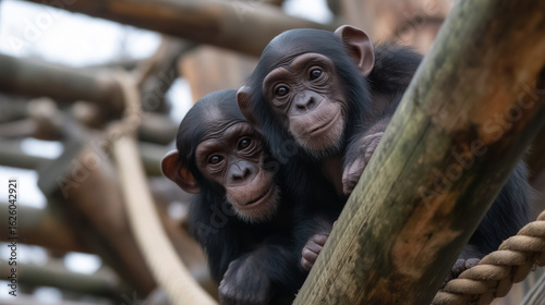 Chimpanzees climbing on wooden structures at Zoo Wroclaw, rope bridges, active playtime, people watching below chimpanzees zoo, primates zone, zoo activity, climbing animals, monke