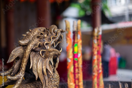 chinese dragon sculpture near incense container