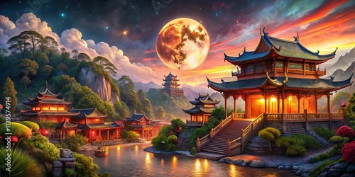 fantasy, low light, photo, mystical, moonlit, architecture, detail, perspective, asian, bamboo forest, pagoda, mountain, river, illuminated, dreamlike, spectacular, imaginative, digital artwork, oriental, dramatic, art deco, storytelling, narrative, illustration
