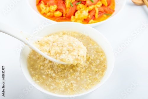 Chinese food set meal quinoa millet porridge with tomato scrambled eggs