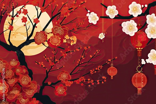 background, design, plant, people, red, light, spring, abstract, holiday, man, modern, pattern, decoration, flower, traditional, art, asian, cute, celebration, culture, asia, symbol, copy space, new, success, family, bloom, party, illustration, corporate, gold, frame, card, chinese, tradition, year, round, festival, greeting, children, flat, china, dog, oriental, new year, wealth, dragon, lunar, chinese new year