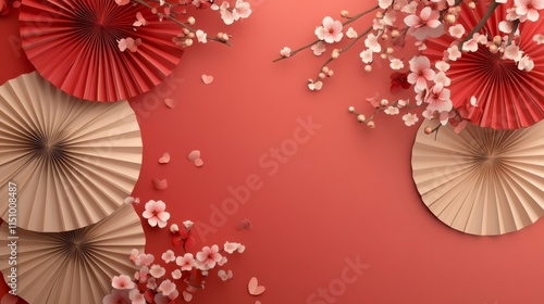 Chinese New Year background with paper fans and flowers, in a red and beige color palette.