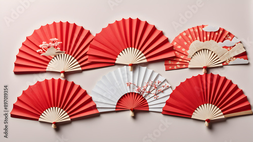 Chinese New Year Banner Template: Top View of Six half folding Oriental Paper Fan on White Background