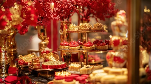 Chinese New Year pastry display featuring delicate mooncakes, sesame seeds cakes, and golden sugar treats, surrounded by red and gold decorations.