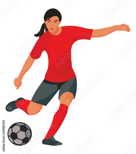 Chinese women's football girl player in a red sports uniform going to kick the ball with her foot