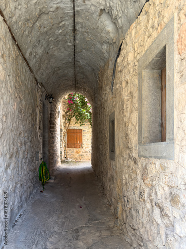 mediaeval, alley, island, greece, village, stone, old, cobbled, architecture, greek, street, travel, wall, arch, narrow, paved, archway, aegean, heritage, traditional, historic, ancient, tour tourism, passage, town, building, destination, stone wall, arcade, door, house, wood, aged, day, europa, window, mediterranean, nobody