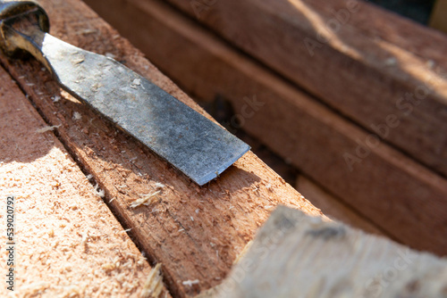 chisel used for work on wooden construction elements, planing of construction beams, woodworking with chisel