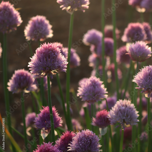 Chives or Allium Schoenoprasum in bloom with purple violet flowers and blossoms against sunlight