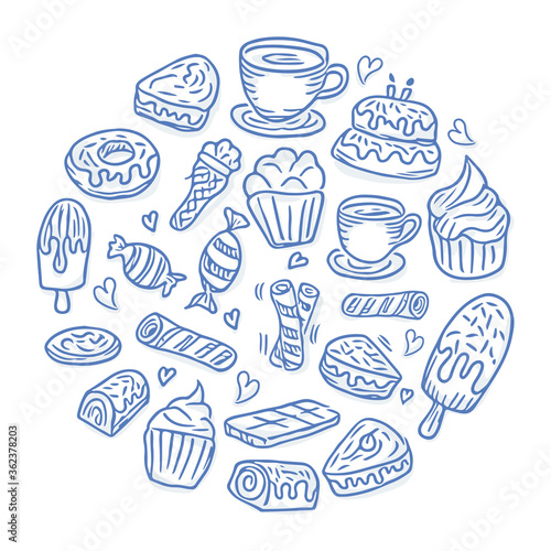 chocolate and sweets food. Sweet dessert and food art elements for kitchen or menu. Ice cream, bakery, cake, tea, chocolate, croissant, pancakes etc.
