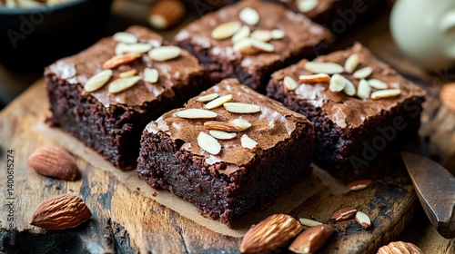 Chocolate brownies with a dense fudge center, topped with crunchy almond nuts