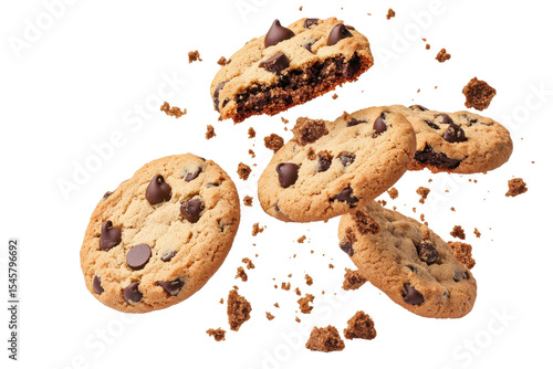 Chocolate chip cookie crumbs flying in the air create a delightful and messy scene of baking, illustrating the joy of homemade treats and the playful nature of dessert indulgence
