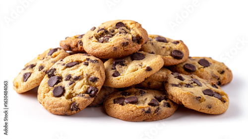 Chocolate chip cookie pattern on a white background. Lots of brown baked cookies, filled with chocolate. Table top view flat lay. Also usable for: data protection, cookie policy, web tracking