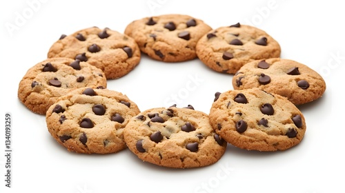 Chocolate chip cookies arranged in a circle on white background