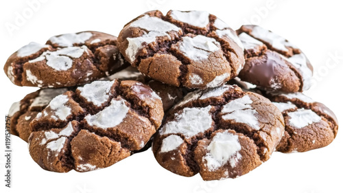 Chocolate crinkle cookies stacked in a pile, isolated on transparent background