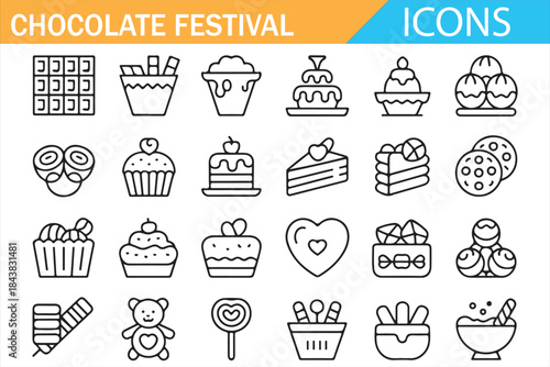 chocolate, festival, icon, outline, dessert, sweet, candy, cake, cupcake, pastry, cocoa, confectionery, bakery, treat, sugar, food, menu, event, celebration, vector, symbol, set, pictogram, graphic, design, isolated, minimal, collection, illustration, interface, app, web, infographic, delicious, epicure, snack