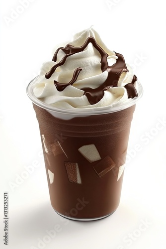 Chocolate frappe in a transparent glass on a white background