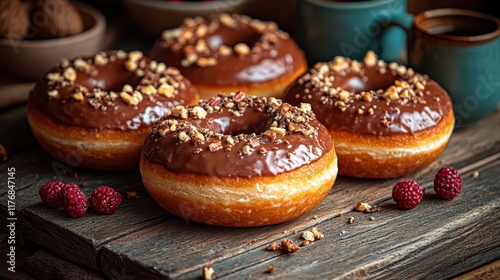 Chocolate glazed donuts with crunchy nuts and fresh raspberries on rustic wood