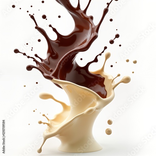 Chocolate, vanilla liquids splash creating beautiful abstract swirl design against plain white background. Dynamic image shows dessert-like drink mixing, perfect for food, beverage advertisements,