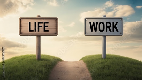 life, work, choice, decision, path, fork, in, the, road, signpost, crossroad, balance, career, personal, lifestyle, opportunity, direction, future, journey, progress, contemplation, option, alternative, metaphor, symbolic, conceptual, countryside, outdoors, nature, landscape, pathway