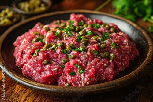 tartare, beef, meat, raw, food, plate, caper, dish, culinary, epicure, meal, fresh, dinner, lunch, delicious, eatery, cookery, wooden, table, parsley, seasoning, ingredient, preparation, serving, eat, healthy, closeup, dark, rustic, tradition, traditional, style, fine, dining, expensive, rich, tasty, juicy, red, green, brown, textured, presentation, studio, still, life, elegant