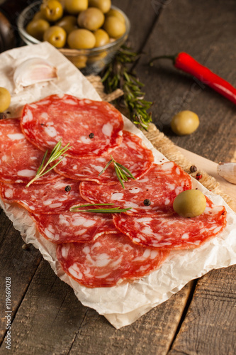 Chorizo sausage and salami, thin cut. spanish salami on the wood background with spices, paprika, pepper. Spicy food. Chili.