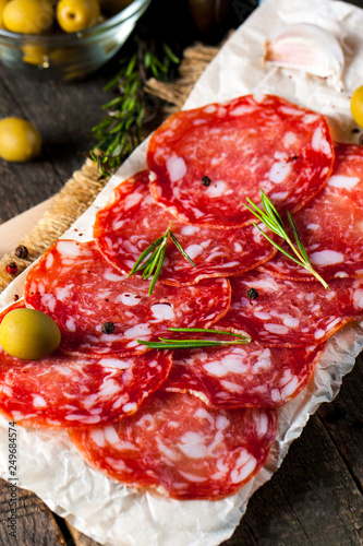 Chorizo sausage and salami, thin cut. spanish salami on the wood background with spices, paprika, pepper. Spicy food. Chili.