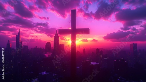 christian, cross, city, skyline, sunset, silhouette, orange, purple, hue, skyscraper, serene, urban, photorealistic, clarity, colours, vibrant, tranquil, atmosphere, building, dusk, warm, scene, spiritual, illuminated, glow, peaceful, architecture, horizon, evening, calm, beauty
