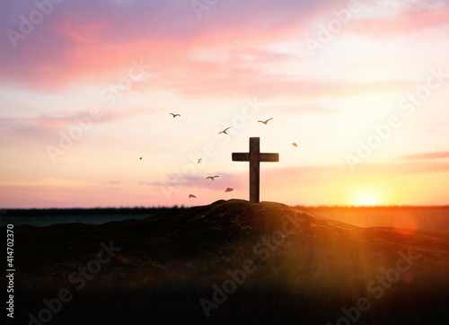 Christian cross on hill outdoors at sunset. Crucifixion Of Jesus