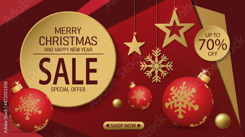 christmas and happy new year sale banner background with festive decoration. vector illustration