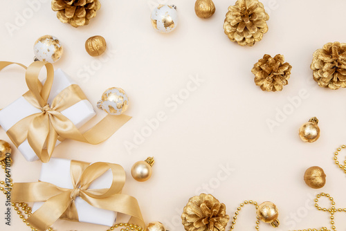 Christmas and New Year background with gift boxes, golden ribbons and decorations. Minimal festive composition with copy space for text or design.