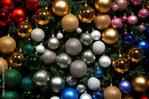 Christmas and New Year background with holiday decorations. Close up of pile Christmas balls, various sizes and colors.