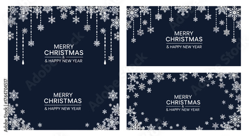 Christmas and New Year banners with snowflakes on dark blue background.
