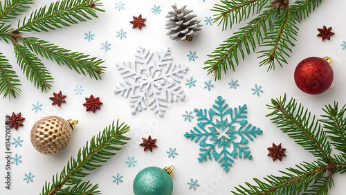 Christmas and new year flat lay composition with fir branches, ornaments, and snowflakes on white background