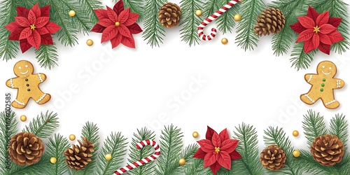 Christmas and New Year's Banner with a Decorative Border of Poinsettias and Gingerbread Cookies