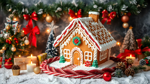 Christmas backdrop with festive decorations surrounding a gingerbread house for a charming touch