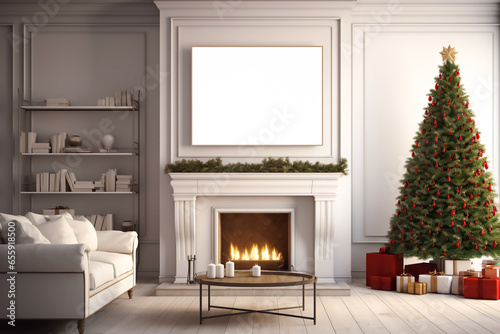 Christmas background of a bright living room. Stylish interior design. A fireplace with a Christmas tree and Christmas decorations, gifts. Modern poster mockup, space for text