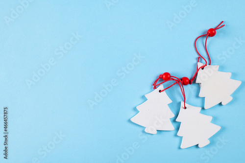 Christmas background. Red and white decorations on blue background. Top view with copy space. New Year flatly. Christmas flatly with decorations