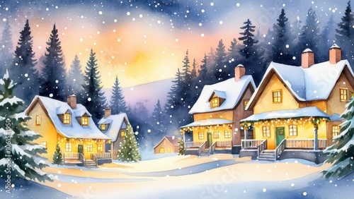 christmas, background, village, snow, winter, cosy, holiday, house, warm, night, pine, tree, light, festive, seasonal, landscape, bungalow, cabin, december, peaceful, illustration, watercolor, traditional, serene, scenic, dark, snowfall, cold, home, forest, wood, festive season, rural, magical, glowing, night sky, celebration, soft, outdoors, beautiful, snow-covered