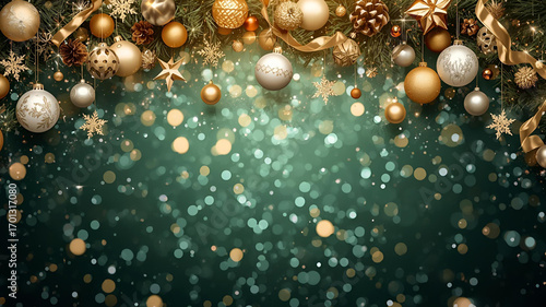 Christmas Background with Golden Ornaments and Bokeh Lights
