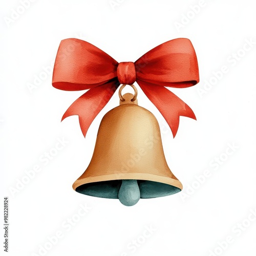 Christmas bell clipart, golden with red ribbon, watercolor illustration, metallic colors, isolated on white background
