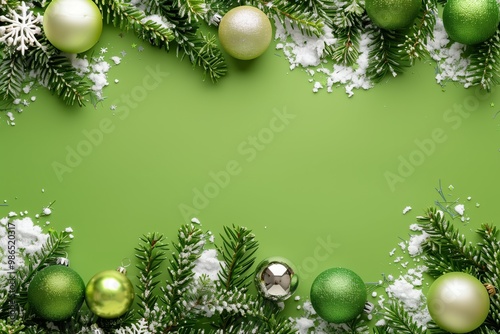 Christmas border arrangement with green, gold, and silver baubles nestled among snow-dusted pine branches on a vibrant green background, creating a festive and refreshing holiday frame