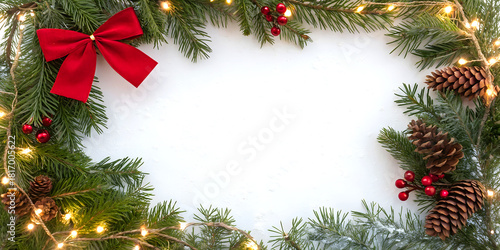 Christmas border made of pine branches, a bright red bow, berries, pinecones and warm holiday lights surrounding a clean white center space. Perfect for greeting cards, invitations, holiday flyers